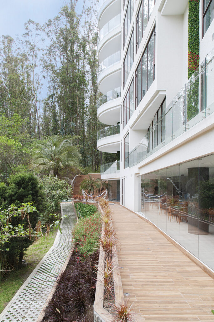 El entorno es el gran protagonista de este edificio concebido para fusionarse con él de manera orgánica y minimalista. Sorprende constatar que estamos en uno de los sectores más céntricos de Quito, pero también que la mayor parte de los árboles que circundan al edificio son más altos que el mismo. Por tres de sus cuatro costados la vista es naturaleza, y hacia el frente una enorme y alargada ciudad que se extiende desde las faldas de un imponente volcán.