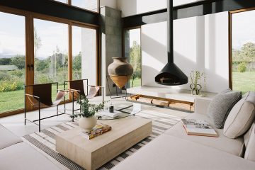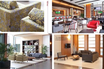 Siguiendo hacia la sala, la tendencia para la ambientación y mobiliario evidencia un estilo fusión. Muebles capitoneanos en gris terciopelo y accesorios en negro, ambientados con acabados al hormigón y panelados en paredes, fieles al estilo oscurantista y frio de lo industrial-escandinavo, volviendo aún más icónico al espacio. Todo se amalgama con la elegancia del glam, presente en otros detalles y accesorios.