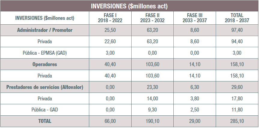 En la siguiente tabla consta la proyección de inversión para los próximos veinte años, que se desarrollará en ZEDE Quito, en términos de valor actualizado: