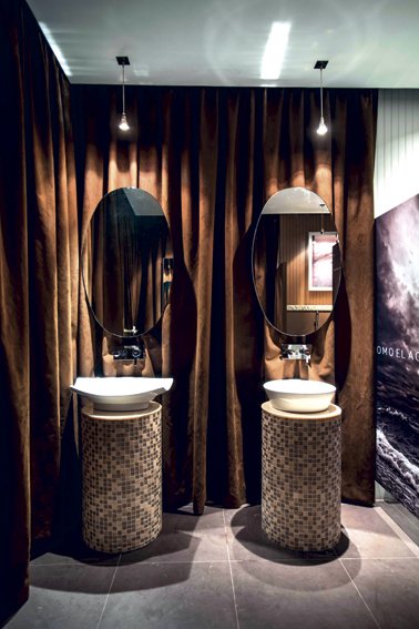 El tema planteado fue “El Teatro”. Las cortinas pesadas recuerdan a los telones teatrales, y en medio de ellas aparecen las piezas de grifería y los espejos como si levitaran por fuera de ellas.