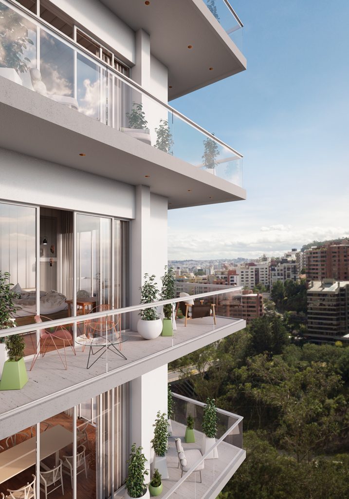 Barreto saca ventaja de la pendiente natural en la que se encuentra el terreno, sobre el que se erige como un ícono representativo de lo que es vivir en la ciudad, pero a tal altura que el ruido y la contaminación no lo alcanzan. Gracias a la geografía de Quito, la distribución de espacios interiores prioriza espectaculares vistas desde todas las áreas de los departamentos. Los enormes ventanales piso techo y las amplias terrazas garantizan coloridos y diferentes paisajes a cada hora del día y la noche, mientras mágicos atardeceres muestran a Quito como si naciera a sus pies. Las emociones van y vienen, y hay que sentirlas, porque explicarlas es imposible.