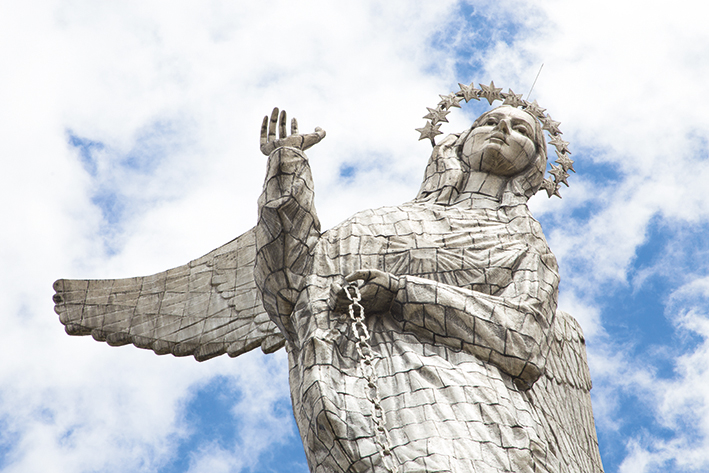 Se trata de un mosaico de 7.000 piezas de aluminio y otros metales, una réplica perfecta de la obra de Bernardo de Legarda, escultor de la Escuela Quiteña, que se encuentra en el altar de la iglesia de San Francisco. La estatua tiene 30 metros de altura y fue inaugurada el 28 de marzo de 1975. La imagen de la virgen que reposa sobre una construcción de cuatro niveles a base de hormigón y revestido de piedra volcánica, está posada sobre un globo terráqueo con una serpiente que representa el mal, encadenada a sus pies. Tiene alas, y hace alusión a la Virgen Apocalíptica descrita con detalle en el libro bíblico del Apocalipsis.