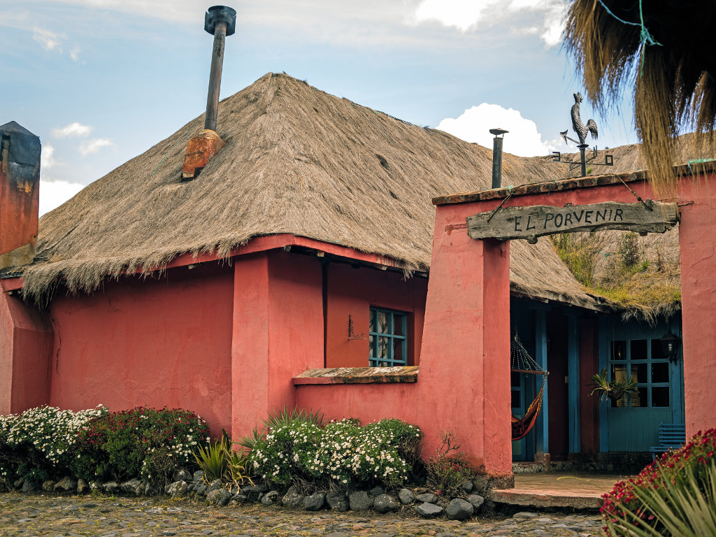 The main house was built in 1991 by its owner, Juan Fernando Pérez, on a spot that previously had only soil, sky and highland views. The design and materials correspond to local customs, with clay walls, straw roofs and eucalyptus boards. This echoes the spirit of traditional Andean houses. Following both design principles and practical needs, several other constructions were built around a large patio. Besides the main house, there are stables, a farm machinery depot, staff lodgings, saddle rooms and warehouses.