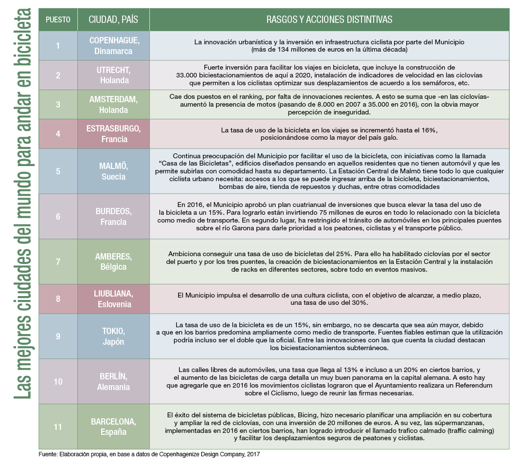 Bogotá es una de las ciudades mejor posicionadas por número de viajes reportados (611.472 diarios) y carriles exclusivos para ciclistas (392km.). Por su lado, Sao Paulo es la urbe con mayor cobertura de bicicletas públicas (4 bicicletas por cada 10.000 habitantes).