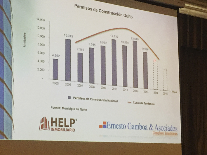 Informó que en Quito, entre los años 2005 y 2010, la tendencia en el número de permisos de construcción fue creciente y sostenida; y a partir de ahí empezó el descenso, interrumpido solamente por un pico en 2012 que reflejó 12.640 permisos otorgados. El 2013 cierra con alrededor de 9.900 permisos, número que desciende a aproximadamente 7.000 permisos en 2014, y continúa el descenso hasta llegar a 5.000 en 2015. Según señala, el descenso en 2015 no es solamente producto de la atípica situación que se experimentó en junio de ese año, sino que evidentemente es un proceso que nació en años anteriores y desemboca en la situación actual.