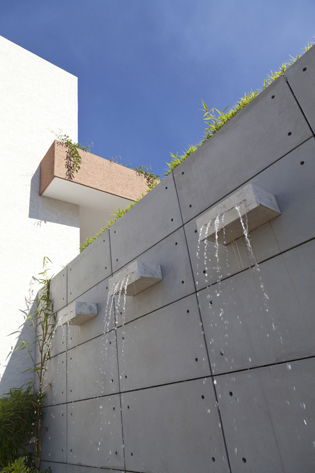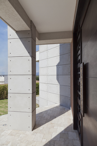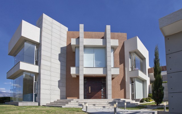 La fachada sobresale del terreno presentándose con fuerza protágonica. Siendo esa la intención, se incorporaron planchas de piedra decoradas con perforaciones en la fachada y paredes exteriores. El cerramiento de vidrio que rodea la casa magistralmente integra las zonas cubiertas con las descubiertas, convierte a las vistas en parte de la decoración, y permite gran ingreso de luz natural. A pesar de su dimensión, la limpieza no es compleja puesto que el mármol travertino facilita la tarea.