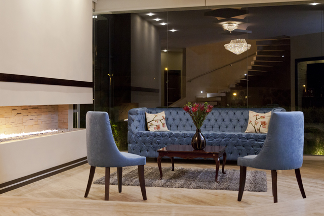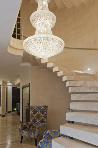 Una discreta puerta de ingreso nos guía hacia el interior de una maravillosa casa. La construcción es perfecta, su arquitectura es cautivante, el entorno del Valle de Cumbayá y la espectacular vista son el escenario que la acogen. Una lámpara fabricada en cristales de Bohemia y las gradas voladas que la envuelven, se roban el protagonismo una vez que se ingresa al hogar. Sus dimensiones y belleza quitan el aliento a quienes se dedican a observarlas.