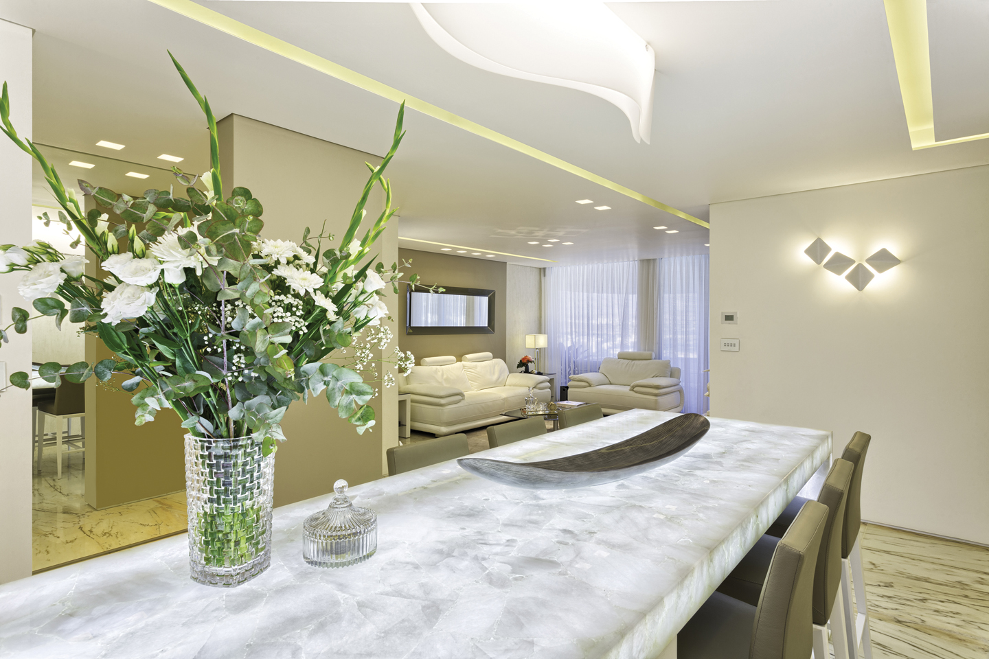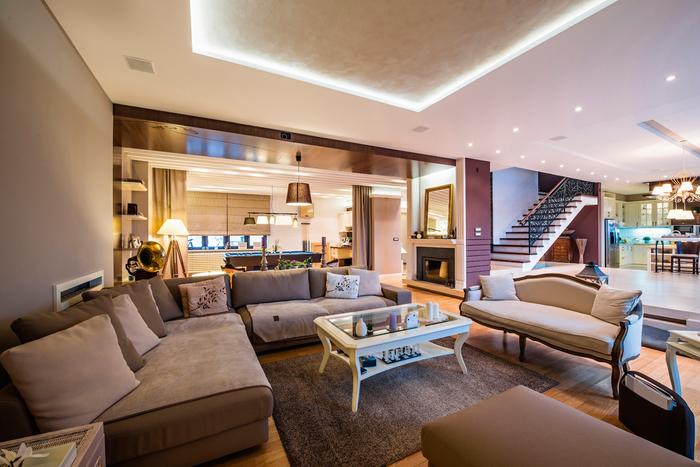 La sala es el centro social. Se debe colocar los sillones de tal forma que las personas puedan verse e interactuar con facilidad, esto logrará un ambiente de unión. Los sillones en forma de “L” son una excelente alternativa, o podemos optar por colocar los sillones formando un ángulo de 90 grados. El complemento ideal es la mesa central decorada con flores, libros o una escultura. Esto depende de los gustos de cada persona, porque si son el reflejo de su personalidad generarán un ambiente placentero.