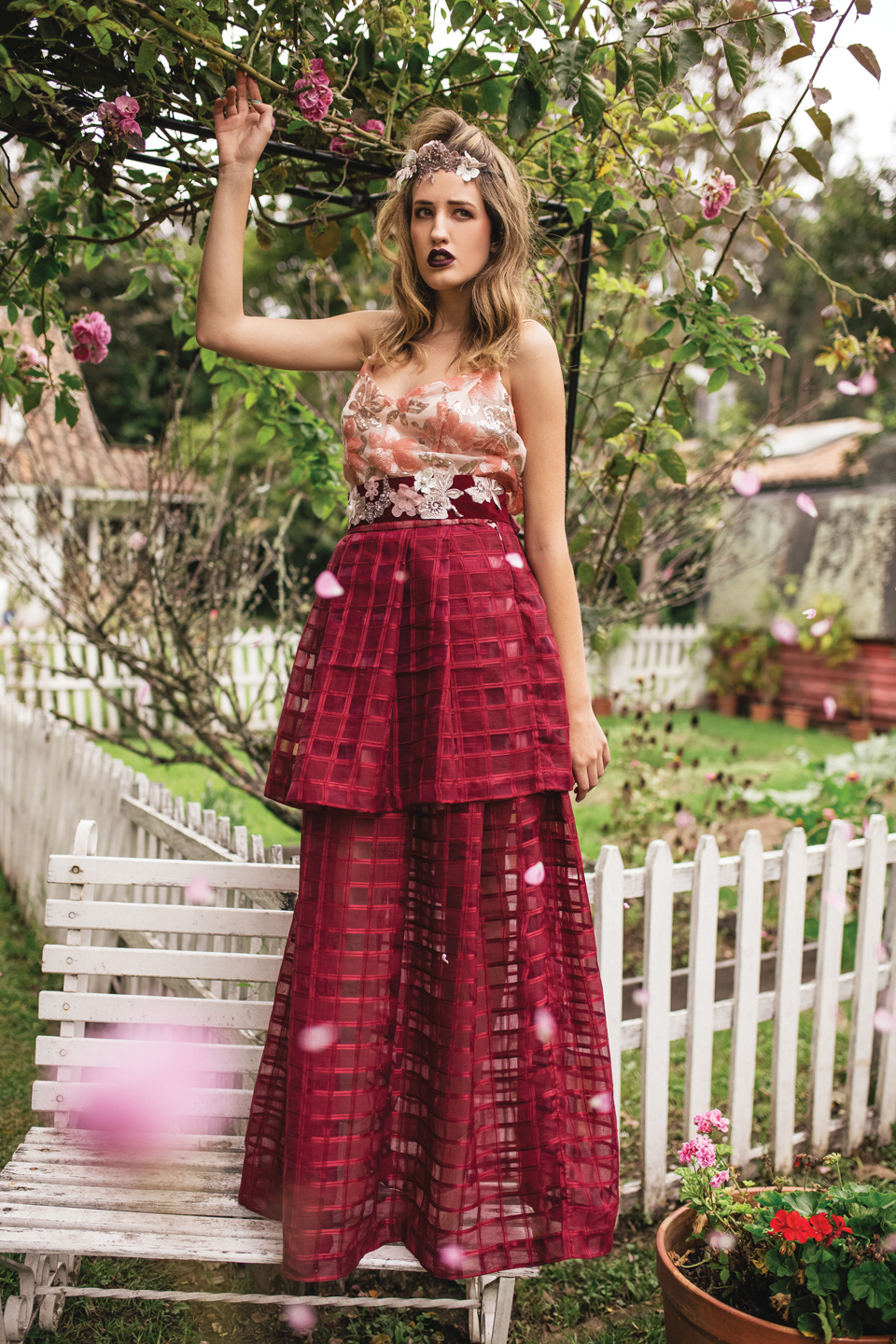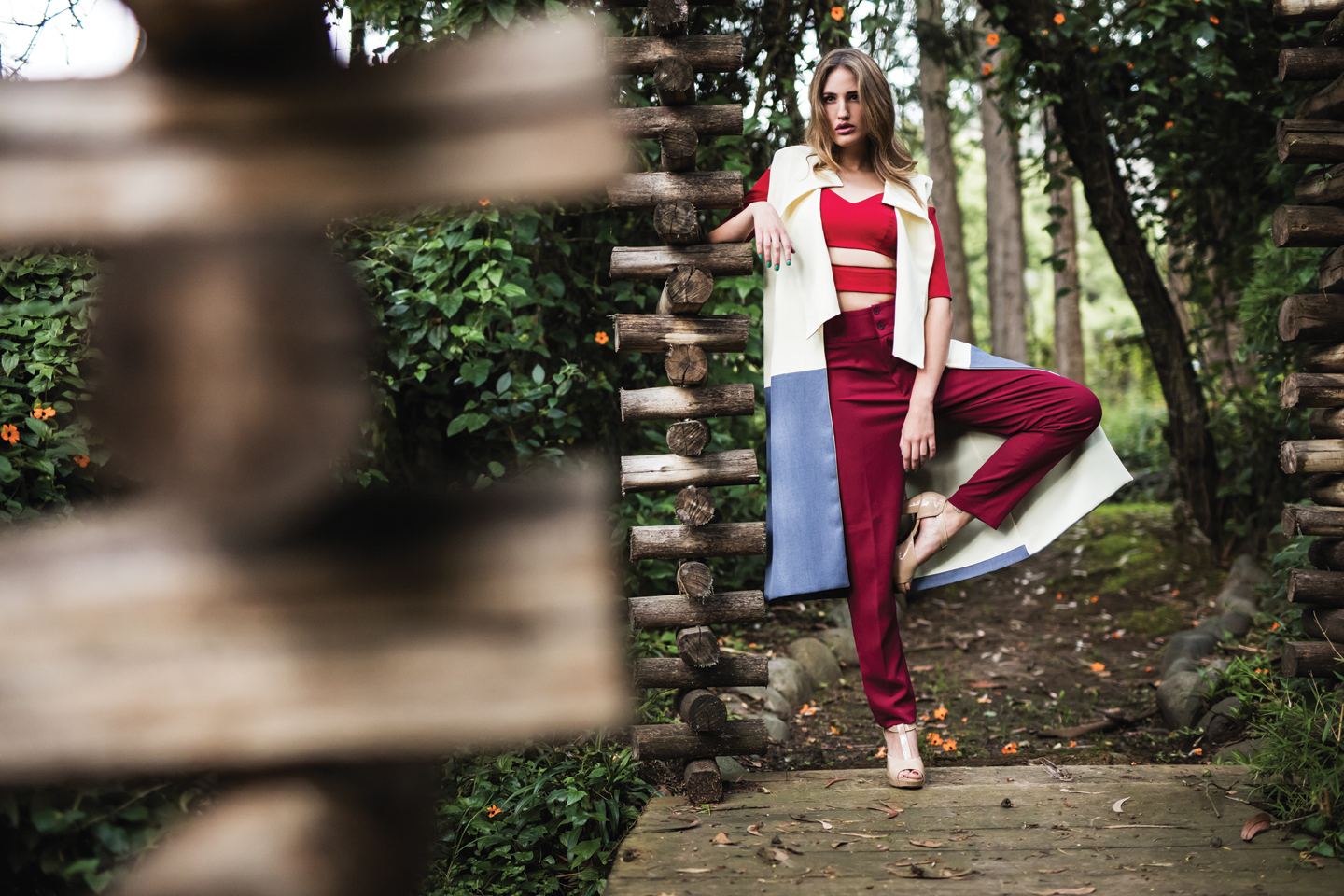 Chaleco largo bicolor con pantalón magenta y top rojo