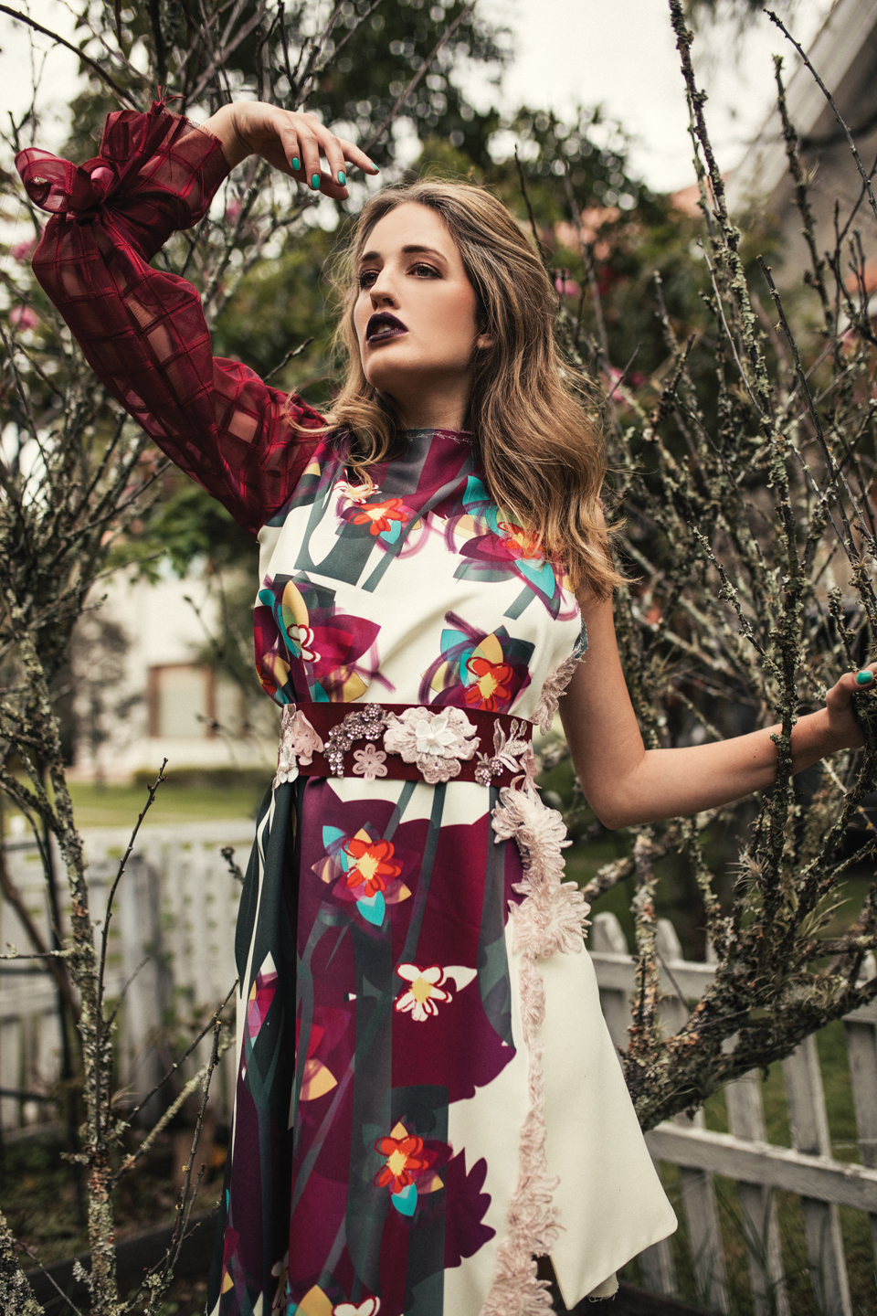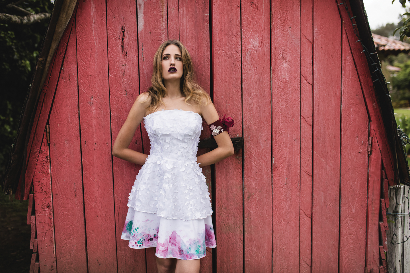 Vestido blanco floreado pintado a mano en acuarela y manilla para brazo bordada a mano.