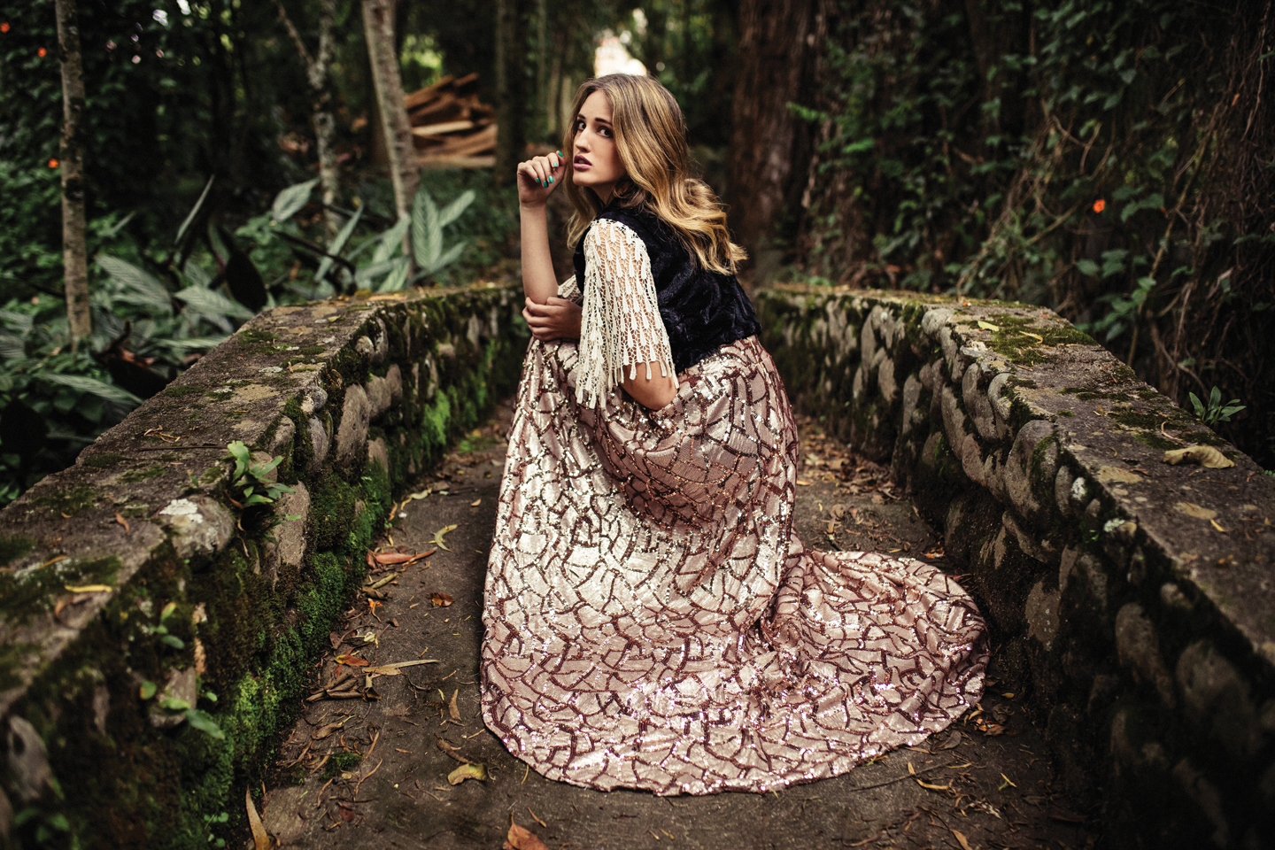 Falda de lentejuelas con chaleco de felpa sintética negra y mangas de guipur beige