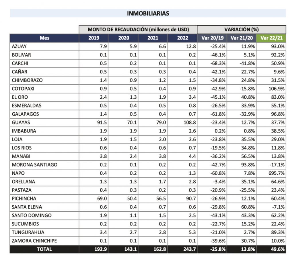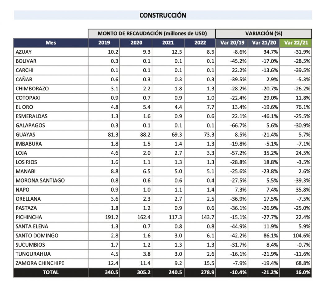 Fue de $530 millones. El sector de la construcción aportó con $280 millones y las actividades inmobiliarias lo hicieron con $250 millones. Los crecimientos son del 16% y del 50% respectivamente, en comparación con lo generado en 2021. Hay varios factores que impulsan estos crecimientos. Por un lado, la tasa de interés subsidiada por el gobierno nacional para vivienda de hasta de $103.000, y por otro, la gestión del Miduvi que ha hecho un trabajo importante en el proceso tramitológico para facilitarlo, digitalizarlo y dar confianza a los promotores inmobiliarios. Ahora les toca a los GAD actuar para también agilitar sus trámites y evitar ser un cuello de botella.