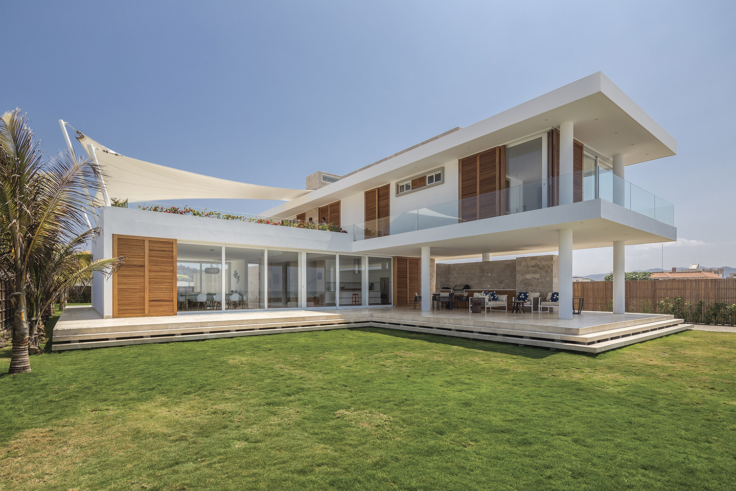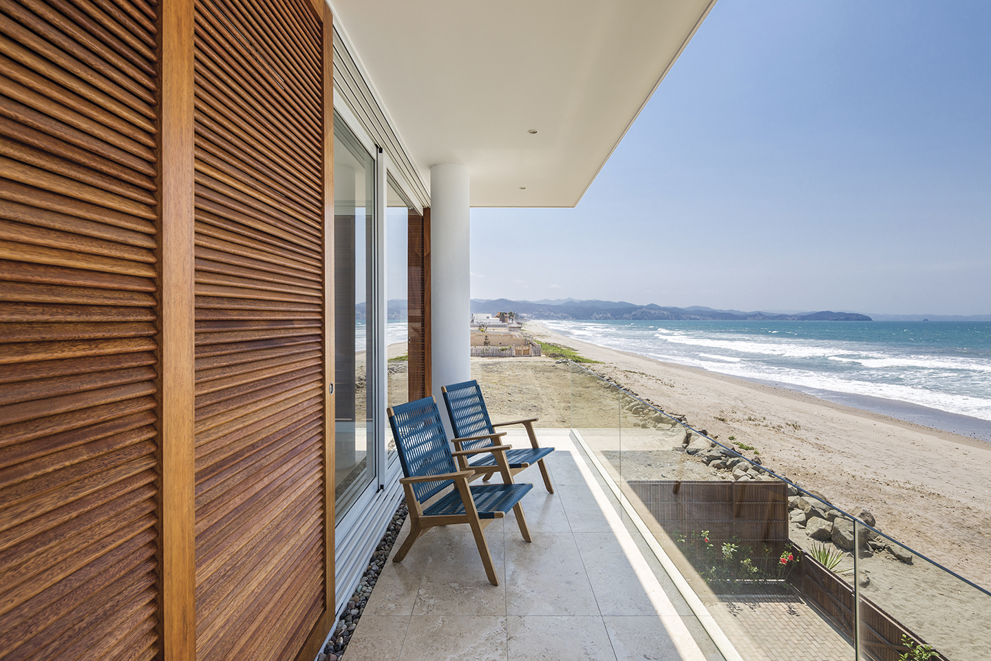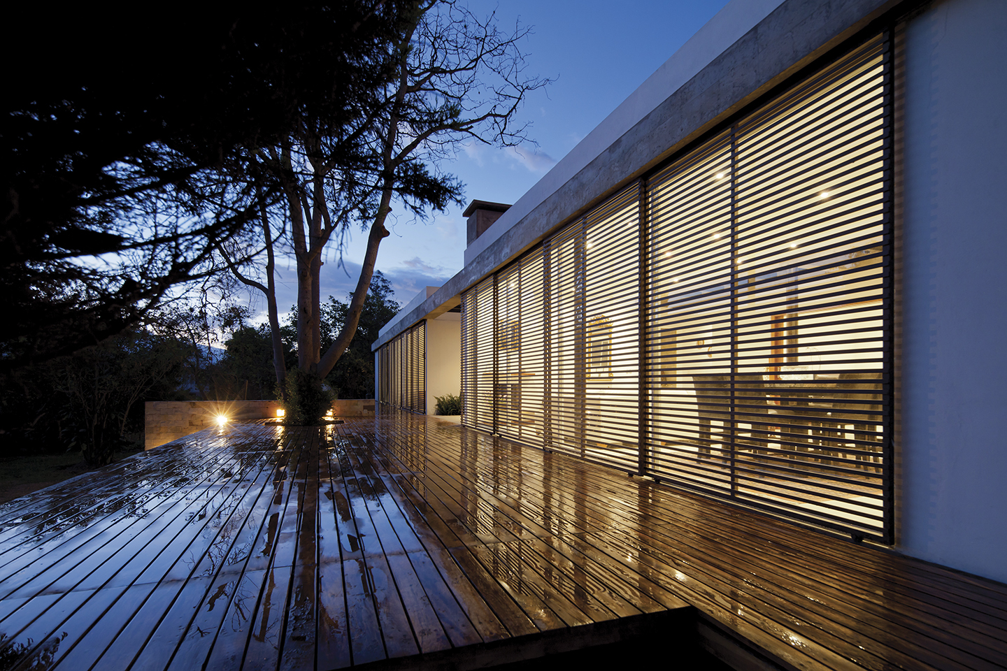 Un elemento importante de la composición que aporta dinamismo a la fachada, son las persianas móviles de madera, que cumplen una doble función: por un lado permiten cerrar completamente la casa en los periodos en que se encuentra deshabitada, y por otro, controlan el fuerte sol ecuatorial.