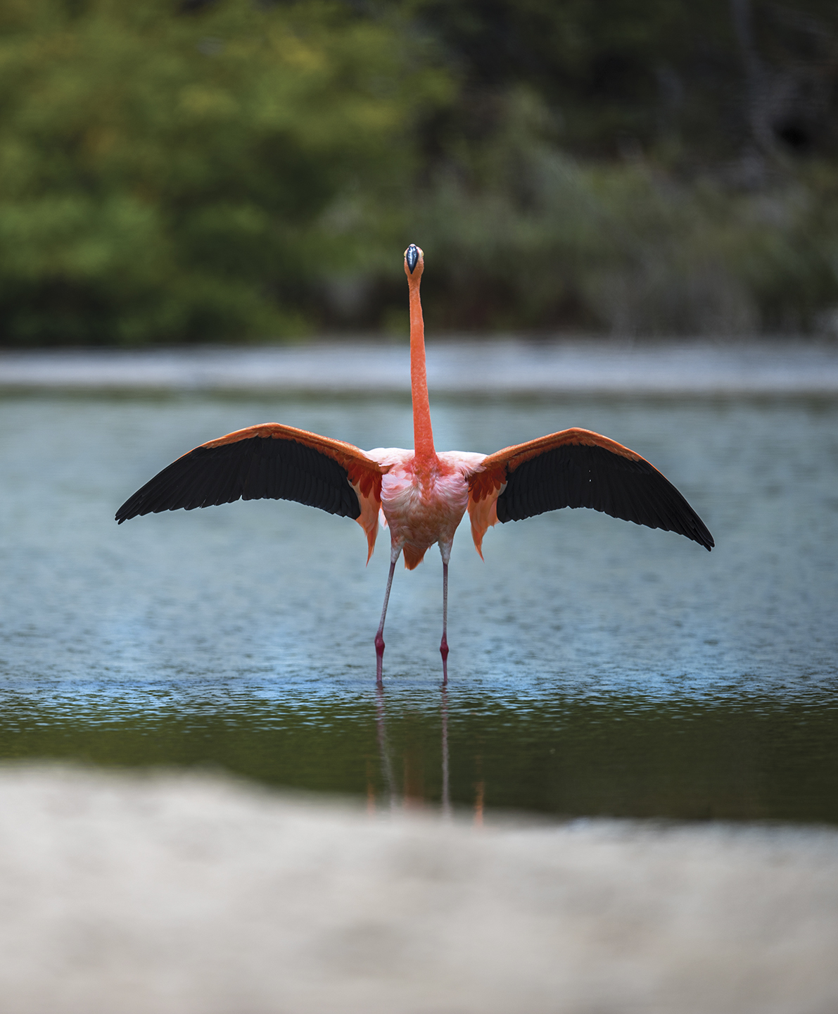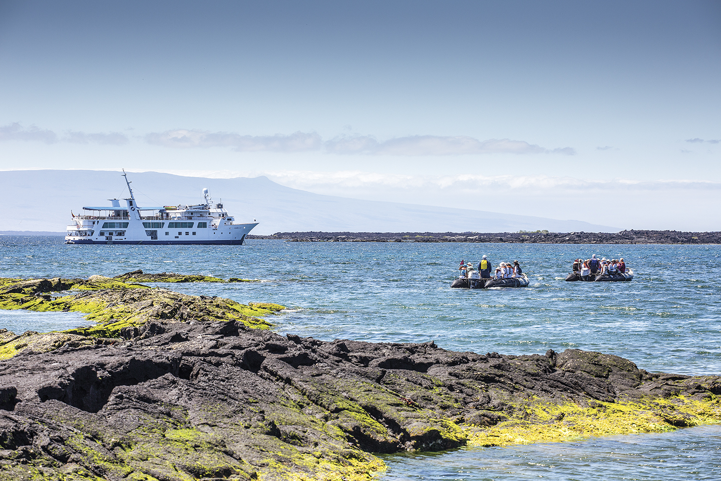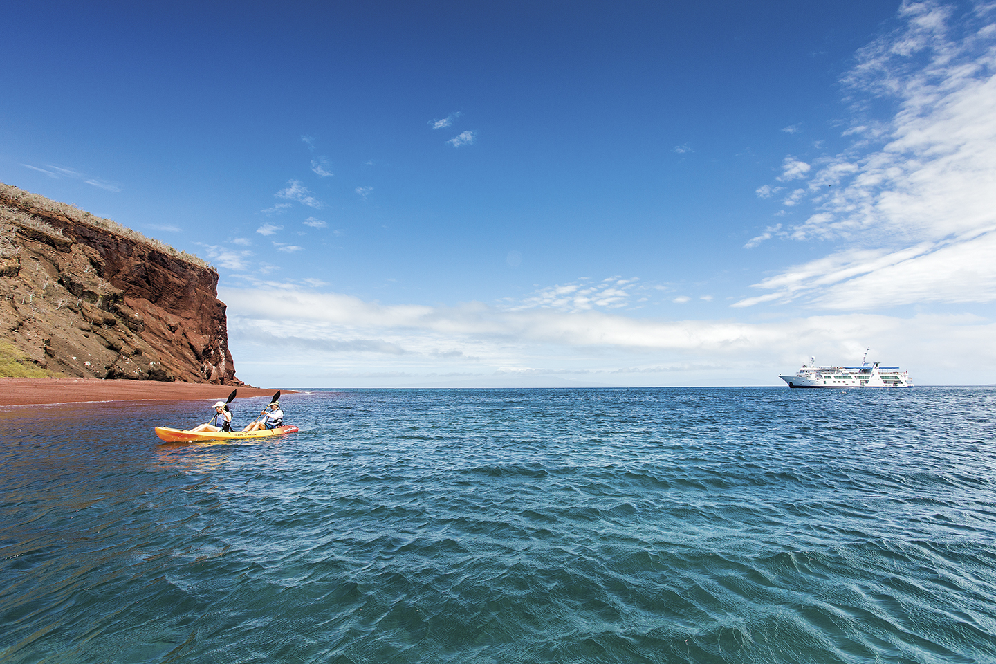 The visit continues to Cormorant Point on Floreana Island, where the expedition takes off toward a lagoon, home to beautiful flamingos, and further ahead, to a white sand beach on the other side of the island, where marine turtles nest at night. There are several adventures to choose from, including a ride in a panga, glass-bottomed boat, or snorkeling on Champion Islet.