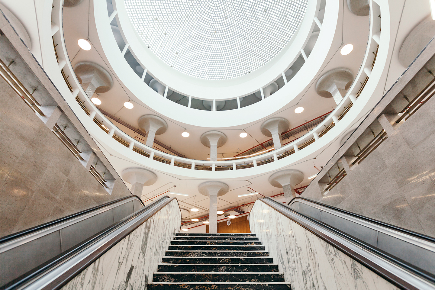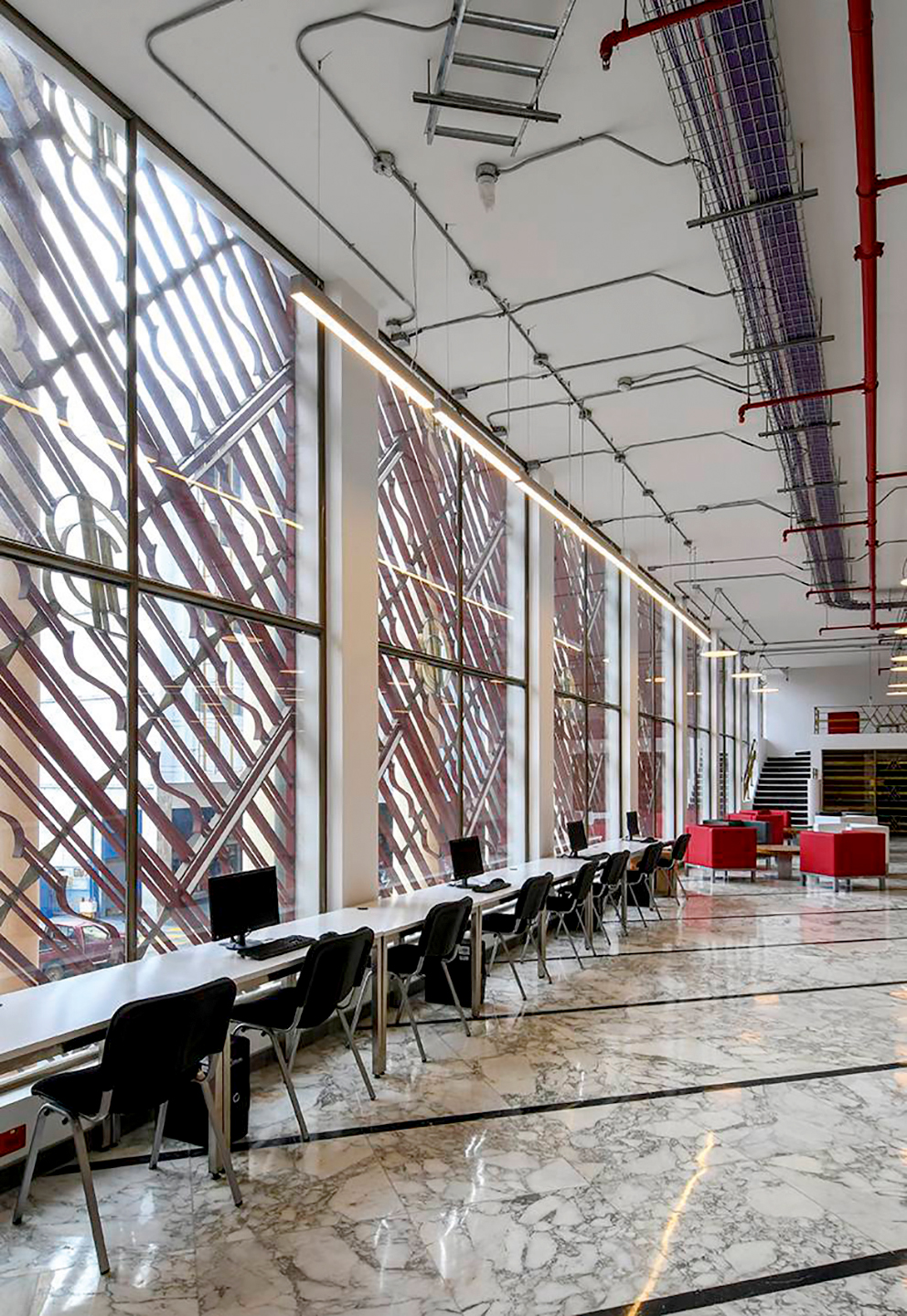 The modern style with which the building was built fits perfectly with the Library innovative scheme. Visitors have direct access to book shelves, they can rest in one of the 486 sofas, armchairs and chairs deployed for their use, and will be attended by friendly personnel only if required.