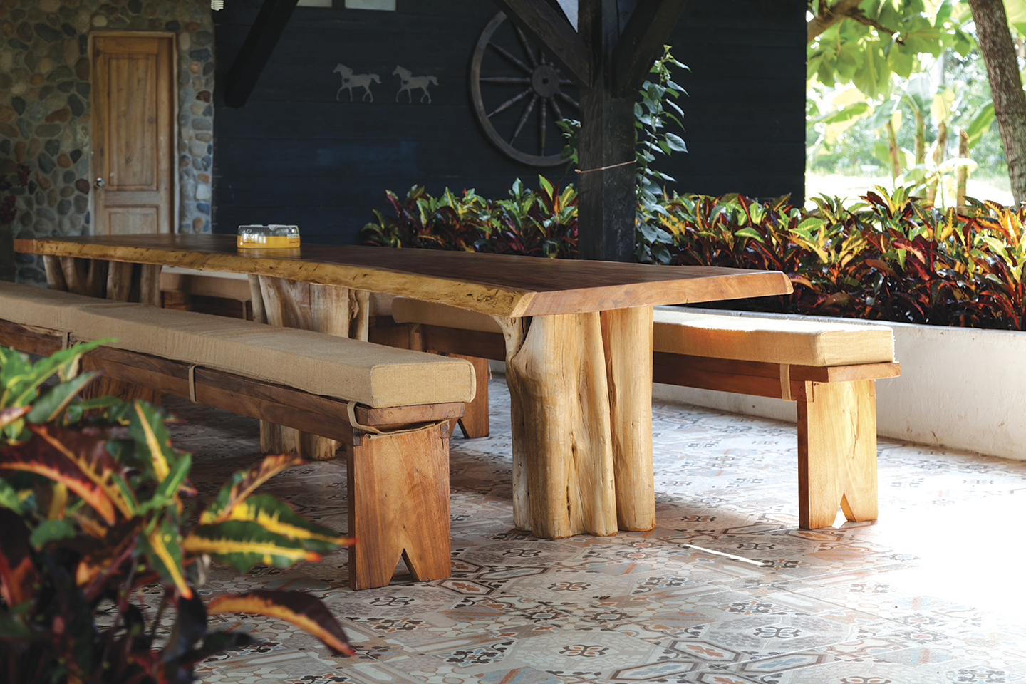 On the ground floor there is a huge porch with a large reception area. A six meters long table made of a single wood piece is the protagonist of the ambiance and perfectly blends with the style of the house. At its side there is a smaller round table, which is the heart of one tree trunk. This area is very close to the river, right next to the jacuzzi, pool and grill, surrounded by a beautiful landscape of gardens, from where the horses can be seen, and the refreshing breeze is felt.