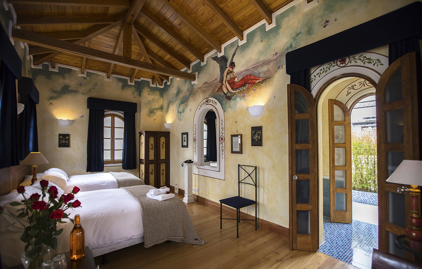 The artistic concept of the hotel, is that, “you live inside a Botticelli”, since of the frescoes made by the excellent Cuenca painter Fausto Merchán, considered among the 16 best painters of the country, used such magical realism that the elements in the paintings seem to come out and use the spaces freely. Every area holds various collections of art, antiques, books and aged furniture that definitely transport guests to a different level of existence.