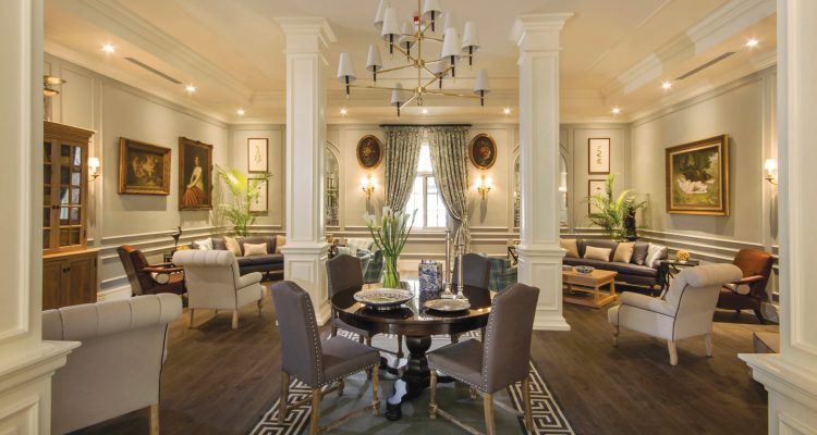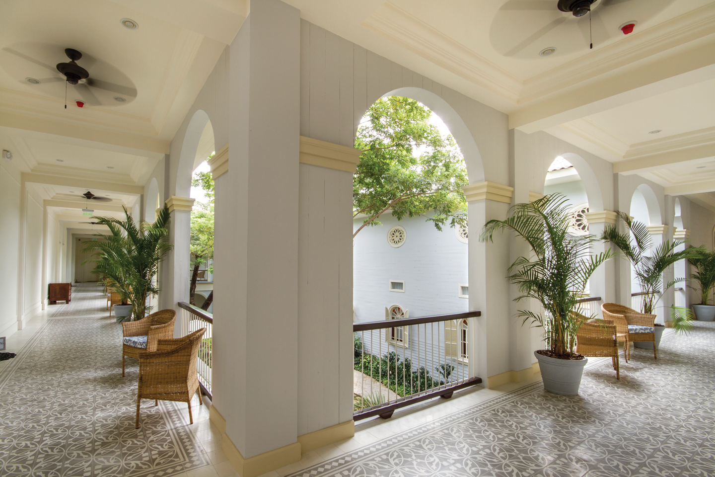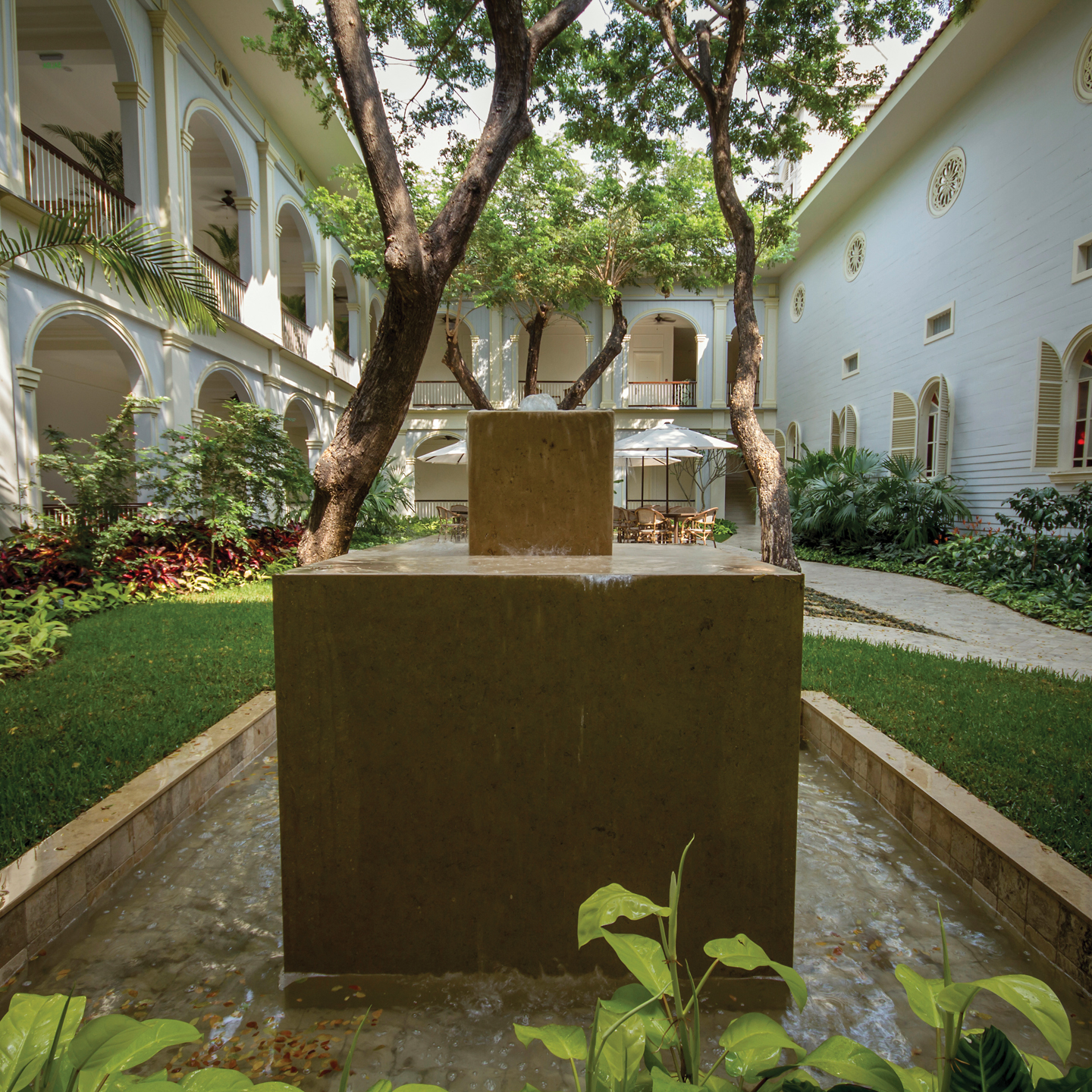 La arquitectura del edificio y su ubicación establecieron la pauta para el diseño de interiores. El estilo republicano fue adaptado a la construcción tropical que caracterizaba a Guayaquil en aquel entonces, y resaltaba por el trabajo en madera. “El desafío fue convertir una edificación austera y patrimonial en un hotel de lujo. Todo esto nos inspiró, a mí y al arquitecto Belisario Luque Marriott, para crear espacios de gran tamaño, con tumbados muy altos, donde siempre se puede apreciar los exteriores y la naturaleza”, nos cuenta Julio Vinueza. Todos los pasillos internos buscan reproducir los pisos con diseños que se usaban en esa época, y son abiertos hacia patios interiores con piletas relucientes y aves que revolotean entre árboles antiguos.