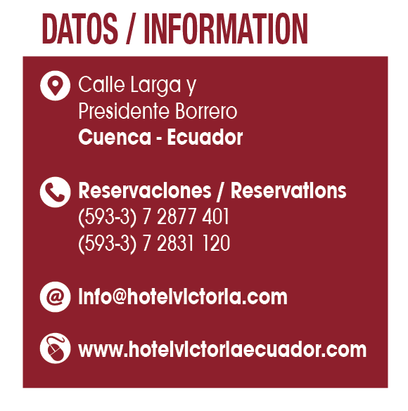 Undoubtedly, this is the best lodging choice, whether for a single traveler or a family, on vacation or on business, for relaxation or for adventure. Hotel Victoria will make your trip to Cuenca an unforgettable one. Perhaps, you will be one of those persons so captivated by Cuenca that you will stay for a long time.