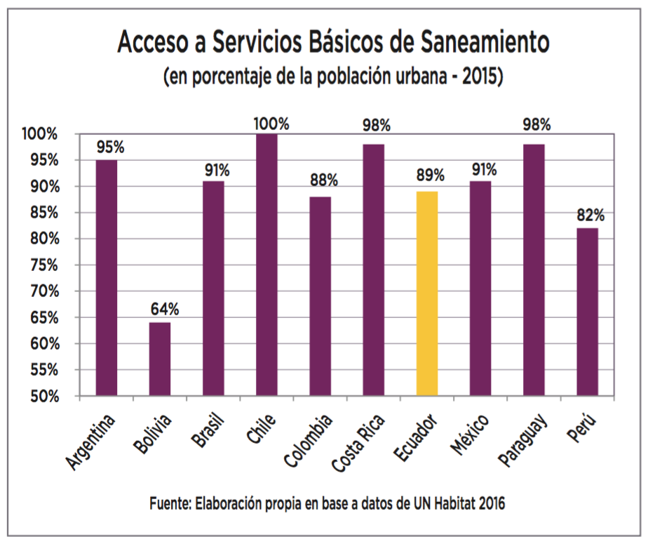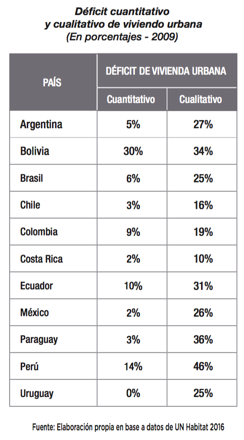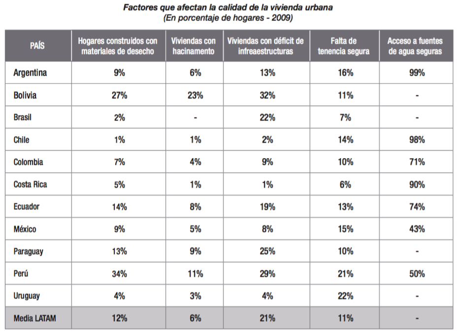 Por ejemplo, el 21% del déficit de vivienda se debe a la falta de acceso a infraestructura (4% a electricidad, 15% a saneamiento, 9% a agua corriente); el 12% se debe a la calidad de la casa (3% a techo pobre, 6% a piso de tierra, 2% a paredes pobres); el 11%, a falta de tenencia segura y el 6% al hacinamiento3. La situación de Ecuador en estos parámetros no es comparativamente mala, situándonos solo dos puntos peor que la media en lo que tiene que ver con los materiales, hacinamiento e inseguridad de tenencia.
