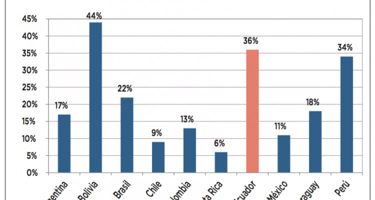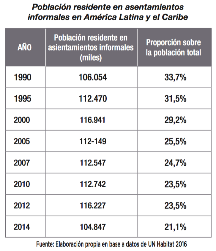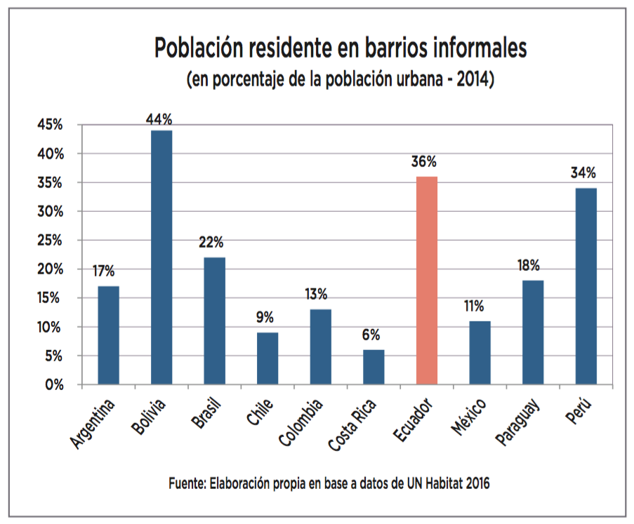 A pesar de los planes de regularización impulsados por los municipios latinoamericanos, los asentamientos informales siguen siendo una porción significativa de las zonas urbanas. Eso sí, con una tendencia a la baja, lo que constituye una buena noticia. Hoy, menos del 21% de la población reside en barrios informales, frente al 34% que lo hacía a principios de la década de los noventa. En el caso de Ecuador, la población residente en barrios informales asciende al 36% de la población urbana, porcentaje que excede de lejos el 6% de Costa Rica, el 9% de Chile o el 13% de nuestros vecinos colombianos. Por el contrario, Perú con el 34% y Bolivia diez puntos porcentuales más arriba nos acompañan en el grupo de países con mayores problemas.