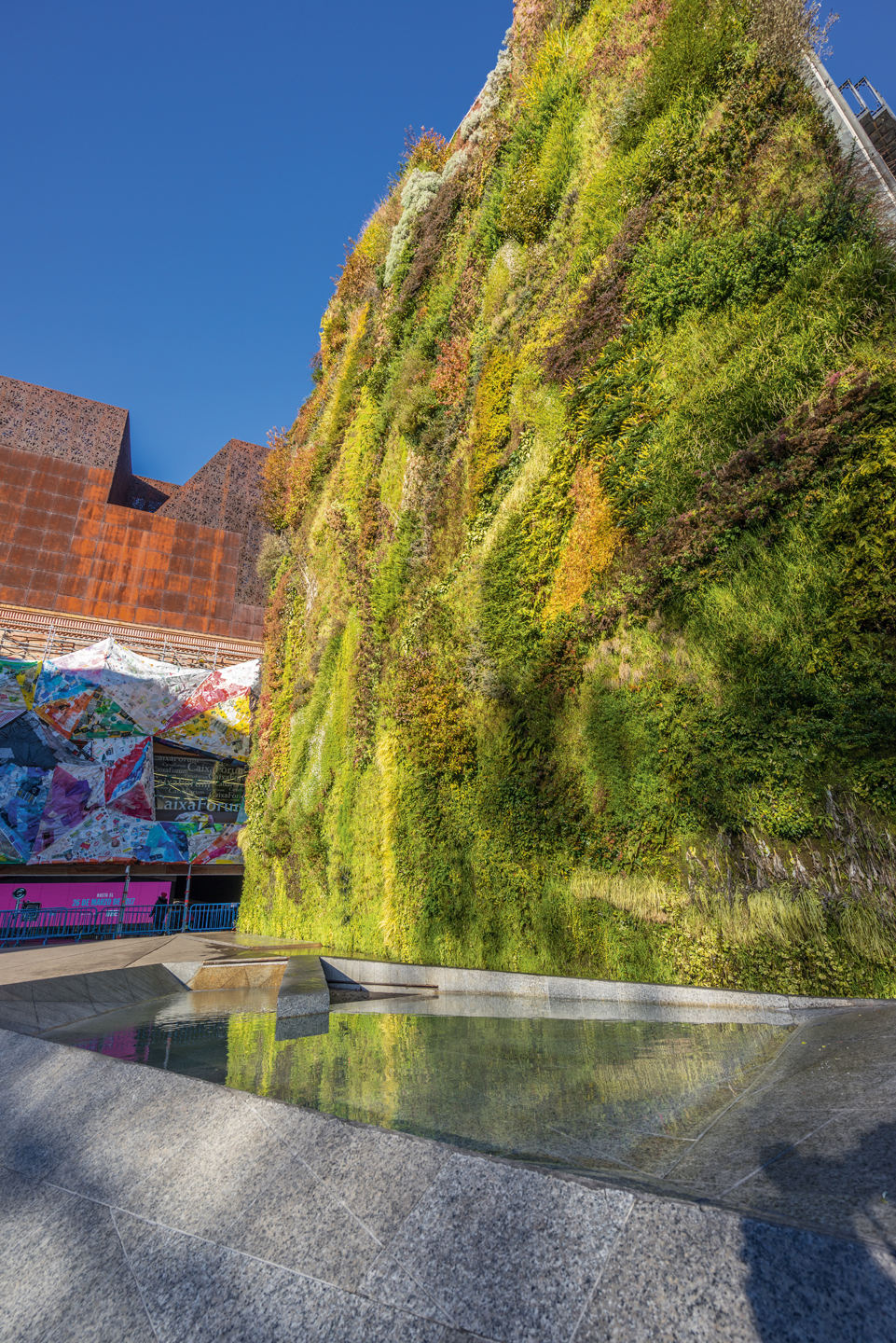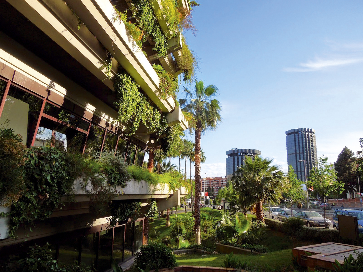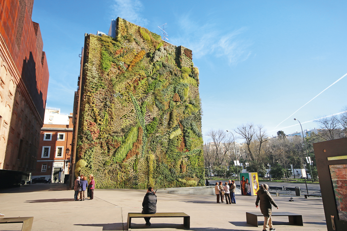 Otro ejemplo de cómo la naturaleza puede cambiar totalmente un entorno urbano es el jardín vertical del edificio del Centro Cultural CaixaForum en el Paseo del Prado, también en Madrid. Se trata de una de las superficies vegetales más grandes de la península ibérica, con 15,000 plantas que cubren una pared de 460m2.