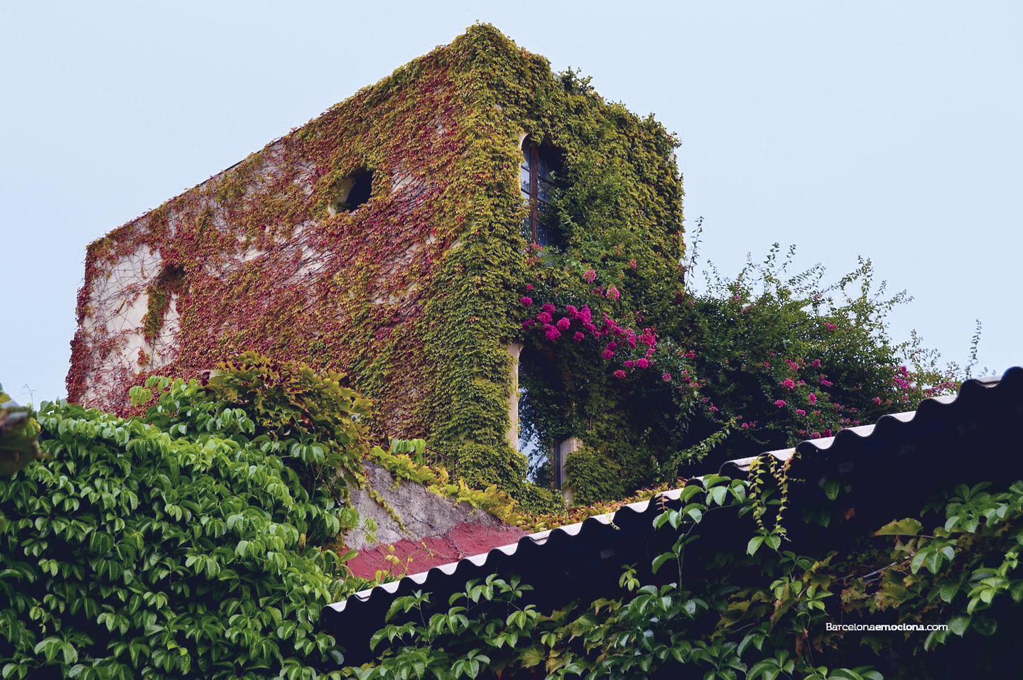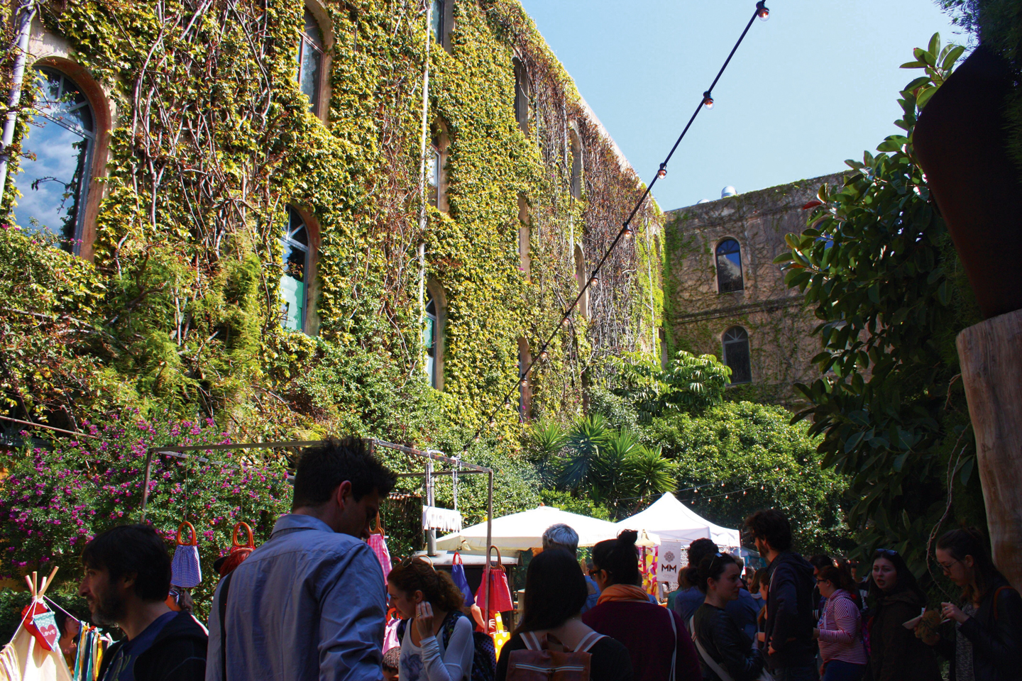 Otro hermoso jardín vertical barcelonés está en la antigua fábrica textil de Poblenou, hoy utilizada como taller de artistas, arquitectos y diseñadores. En este lugar, el primer fin de semana de cada mes, se instala el llamado Palo Alto Market: un mercado creativo de diseño, arte, artesanía y gastronomía. Su fachada, cubierta de buganvillas que cambian de color según la época del año, así como sus callejones ajardinados, son dos de los principales atractivos de este famoso lugar.