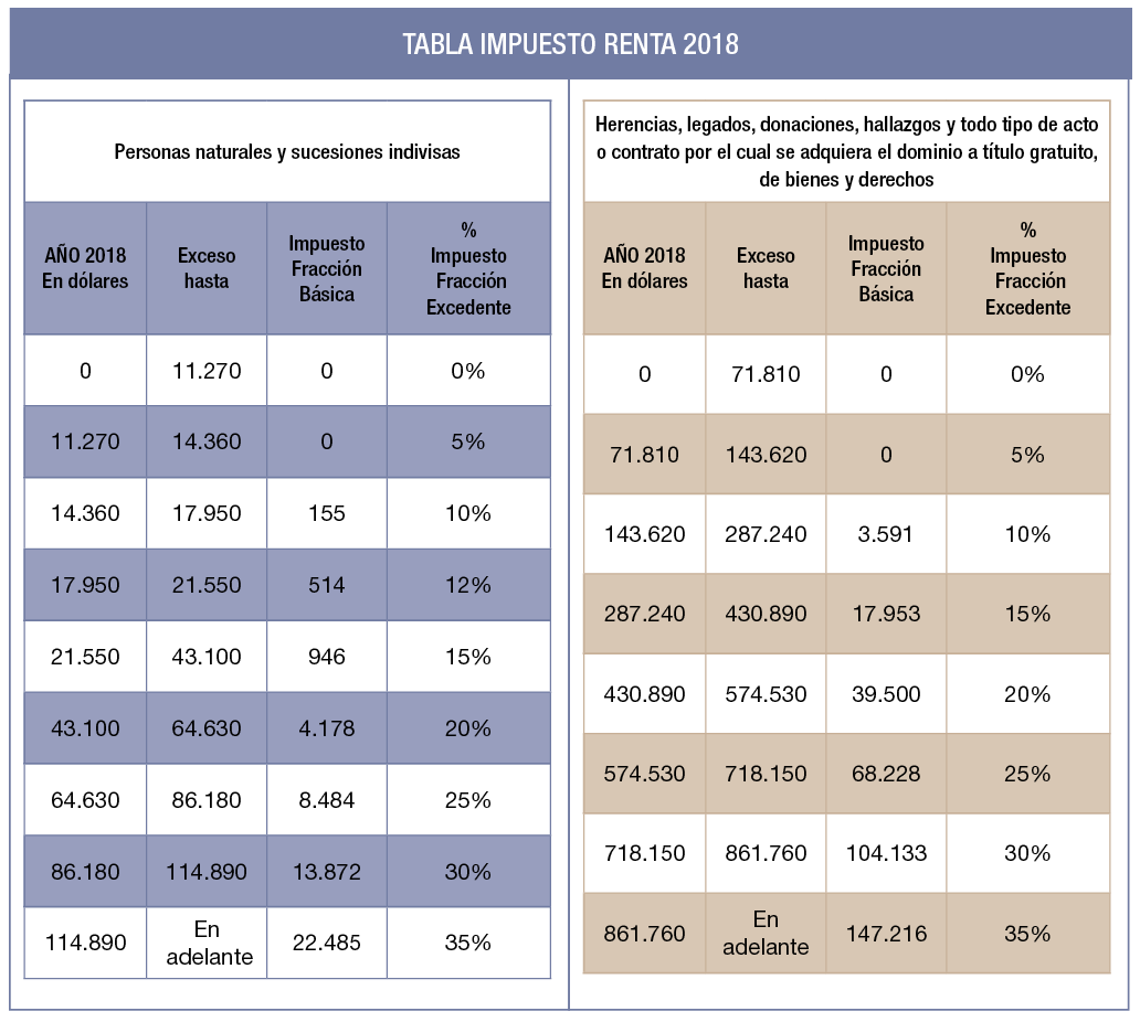 Las reglas de impuestos aplican sin perjuicio del reparto de la herencia que se haga. Tenemos una tabla progresiva (artículo 36 de la Ley de Régimen Tributario), es decir, a mayor valor de la herencia o legado, mayor impuesto. En los dos casos se llega hasta el 35% del valor de la sucesión. Ese es el máximo de la tarifa, pero en casos de herencias o legados a los hijos, éstos pagan una tarifa máxima del 17.5%. Hay que tomar en cuenta que hay una cantidad ($71.810 para 2018) que está libre impuesto. No es un monto fijo, todos los años la tabla se ajusta al índice de precios del consumidor.