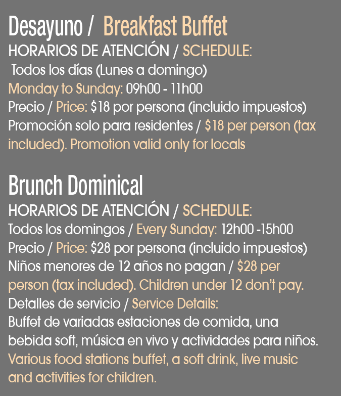 Si en Quito le hablaron del mejor desayuno buffet y un brunch dominical incomparable, sin lugar a dudas se referían al de Bistro Latino. Frutas, cereales, deliciosos panes de sal y dulce, omelettes a su elección, jugos naturales y muchas opciones más para mimar su apetito mañanero, sea desde las mesas interiores o de las zonas exteriores en medio de hermosos jardines.