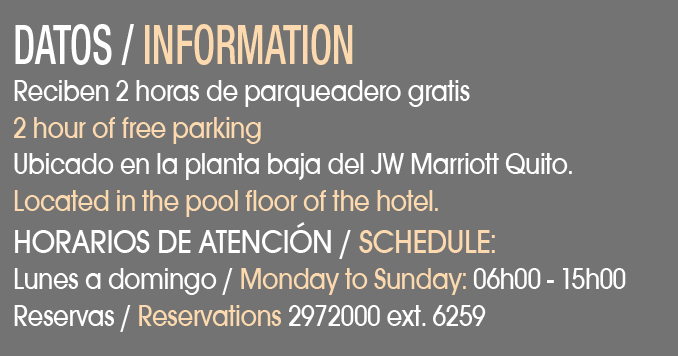 Suena increíble, pero es verdad. En JW Marriott Quito hay algo para todos, no importa la edad, el atuendo, el antojo o la hora del día. Y todo esto con la acostumbrada e infalible atención de primera categoría, y, quién sabe, es probable que lo sorprendan con alguna de sus interesantes promociones. Aquí algunos detalles para que empiece a estimular su paladar.