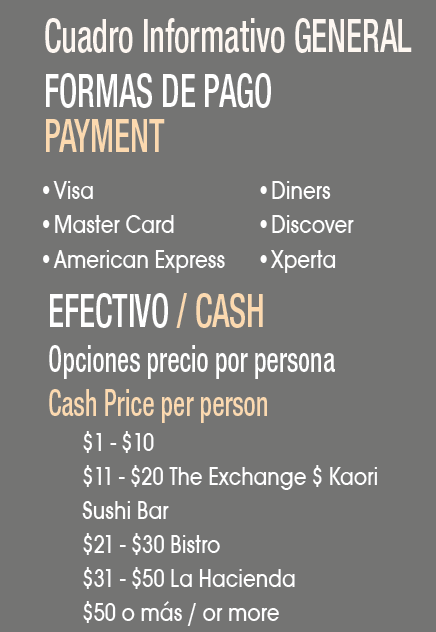 Cada uno de los restaurantes presenta una carta distinta y busca satisfacer a cabalidad el enorme abanico de gustos de los comensales. Las opciones son tan variadas como las decoraciones de cada ambiente. La exclusiva decoración de La Hacienda Steakhouse invita a un ambiente más formal, donde podrá deleitarse con preparaciones artísticamente elaboradas y acompañarlas con su elección de sofisticados vinos. El espacio predilecto para degustar cócteles y picaditas es The Exchange Bar. Kaori Sushi Bar es el lugar ideal para vivir una experiencia de gastronomía oriental, que incluye platos creados con productos locales en magníficas presentaciones. Si el ánimo está más relajado y la ocasión es familiar, nada mejor que disfrutar en Bistro Latino, sobre todo con el delicioso brunch un domingo en la mañana.