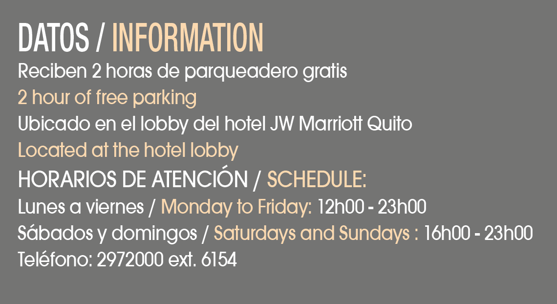 Nada más entretenido que acudir al JW Marriott Quito en un día cualquiera, a la hora que sea, sin importar la naturaleza del antojo que nos guía. Si el apetito está para lo formal, hay opciones; si está de apuro hay otras; y si está indeciso será correctamente estimulado para satisfacer sus más caprichosos instintos. El centro del lobby es el corazón desde el cual se desprenden distintos caminos. Andando de frente, hacia la izquierda o derecha, o incluso hacia abajo, están los múltiples destinos que acogerán su apetito.