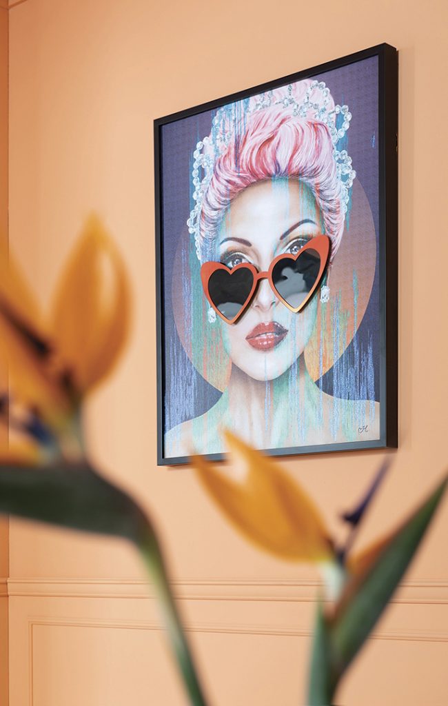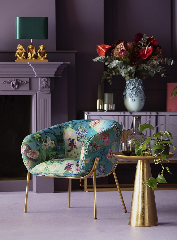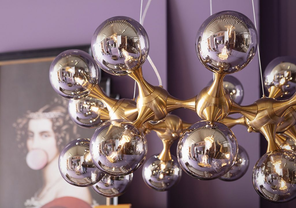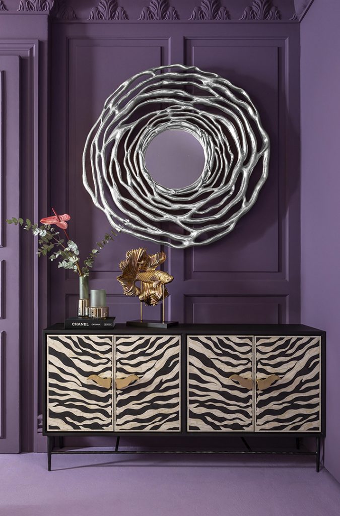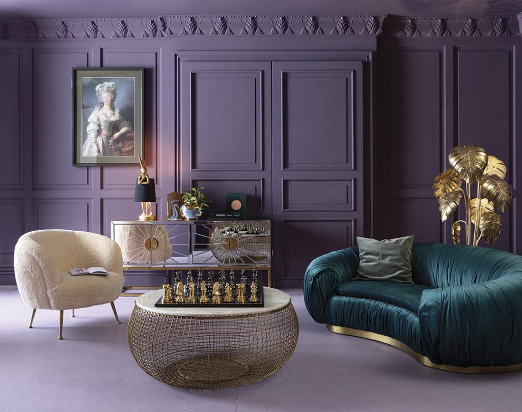Como contrapunto, el color berenjena, o Pantone 2022 Very Peri, aporta una elegante sofisticación, mientras los aparadores, cuyo diseño y fabricación demuestran un único carácter, se convierten en aquellos spots más llamativos. Los sofás Chesterfield entran en un apasionante enlace con las pinturas Pop Art y los objetos artísticos abstractos, mientras que las lámparas evocan lo novedoso sin dejar de lado un guiño al pasado.