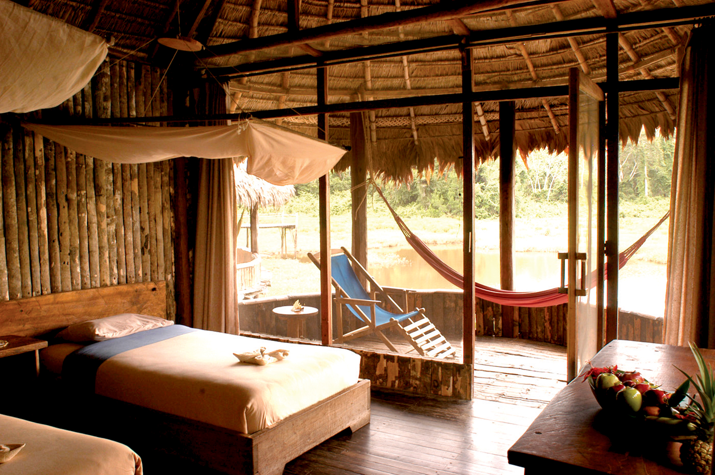 Kapawi Lodge has access walkways that take us from the pier to the different cabins built with ancestral construction techniques used by the Achuar´s community. The restaurant, where delicious dishes prepared with local products are served, is in the central area of the Lodge, along with the well-stocked bar where you can enjoy your favorite cocktail, and the general room where you feel a warm and cozy atmosphere of coexistence where we enjoy long conversations with people from all over the world. Kapawi Lodge is a member of Exclusive Hotels and Haciendas of Ecuador www.ehhec.com