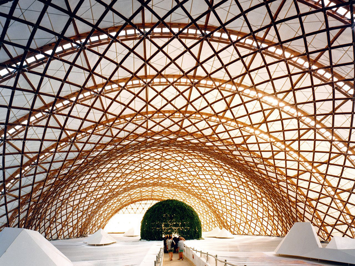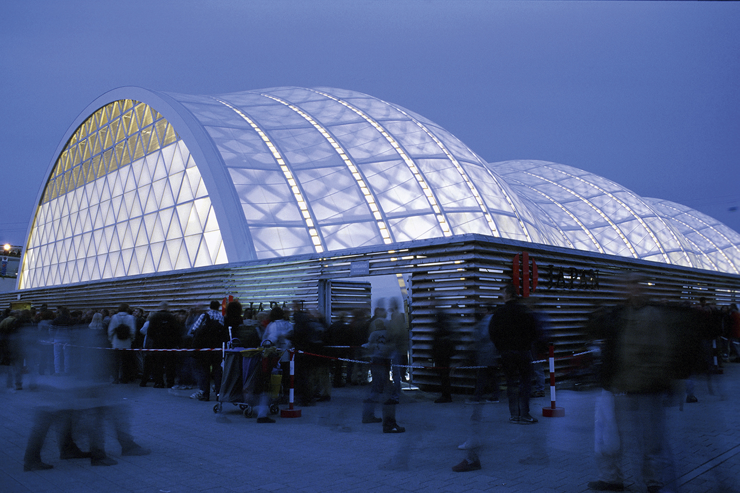 El Pabellón comprendía un área de 3.100m2, distribuidos a lo largo de una nave longitudinal curva. Ban tuvo la iniciativa de utilizar una estructura tridimensional tipo Gridshell, autoportante, en forma de S y con doble curvatura, la cual fue realizada con los tubos de cartón. La construcción del Pabellón fue adecuada a la forma, flexibilidad y uso de materiales, considerándolo uno de los proyectos más innovadores, tanto por su estructura de papel como por haber sido reciclado en su totalidad al terminar su uso en la exposición.