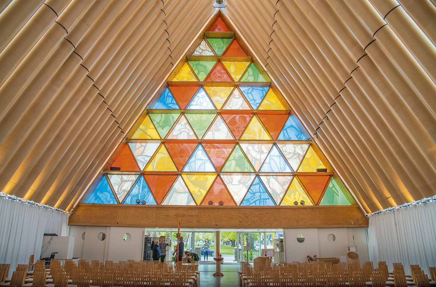 Después del terremoto de magnitud 6,3 que devastó Christchurch, una de las construcciones más afectadas fue la Catedral Gótica de piedra del siglo XIX ubicada en esta ciudad. En reemplazo a ella, Shigeru Ban levanta la edificación más alta en la que se utilizan tubos de cartón en forma inclinada, con una altura de 20.5m y una capacidad para 700 personas.
