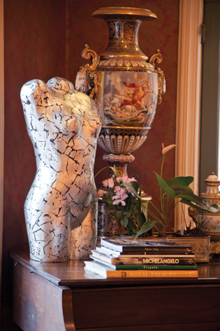 Destaca en la decoración un piano antiguo, cuya superficie sirve de asiento para la escultura de un torso desnudo con acabados en plata, en una expresión muy contemporánea por la técnica utilizada. Las exquisitas alfombras que decoran cada espacio, y los finos muebles, la mayoría de los cuales heredó de su madre, una innata coleccionista, se encargan de completar cada ambiente en armónica comunión.