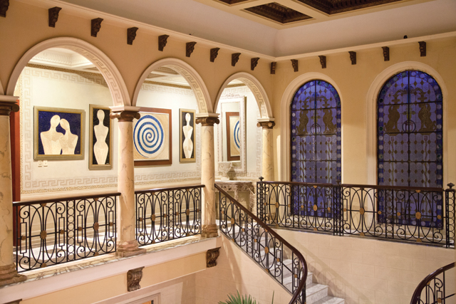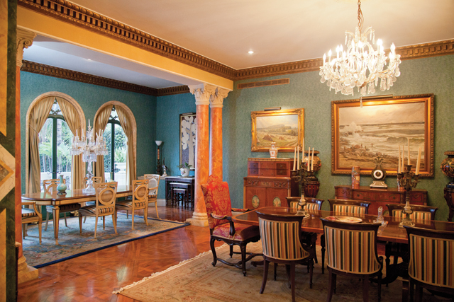 Al entrar, un vestíbulo de doble altura que mantiene armonía con los rasgos italianos de la fachada se despliega ante nosotros. Miramos en 360 grados y descubrimos que cada espacio tiene su elemento decorativo, cada rincón tiene un detalle. Resaltan los ventanales con vitrales de colores contrastando con los pisos de mármol. Paredes y techos lucen maravillosos tapices que se descubren entre columnas jónicas, mientras imponentes candelabros alumbran los amplios salones excepcionalmente distribuidos en la planta baja de la casa.