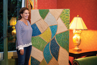 Continuando su aventura con cabuya, hoy la combina con vidrio cortado para lograr maravillosas obras de arte. El vestíbulo de entrada se ilumina con su última creación que se llama “El Bosque de Mandarinos”, un cuadro inspirado en el bosque que se encuentra en su finca, y en el que todas las ramas de los árboles crecen hacia arriba. En esta creación los árboles están hechos de cabuya, y el vidrio lo trabajó con una nueva técnica. “Puse a los vidrios más alargados, porque generalmente el mosaico es de 2cm x 2cm, y les he dado tonalidades de verde”. A este agrandamiento del vidrio lo bautizó con el nombre de la gran ciudad de los rascacielos, New York, porque el mosaico que arman luce como los edificios de la selva de cemento que la conforman.