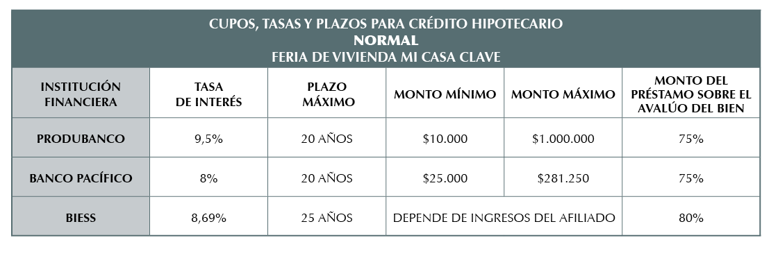 Traspasando el análisis de oferta y demanda, es importante recordar que el factor principal que posibilita la compra de inmuebles es la disponibilidad de crédito hipotecario. En este sentido, la Feria reunió a importantes instituciones financieras del país, como son Biess, Banco del Pacífico y Produbanco. En el Gráfico No. 10 se reflejan las tasas de interés vigentes para hipotecarios y los plazos que ofrecen.