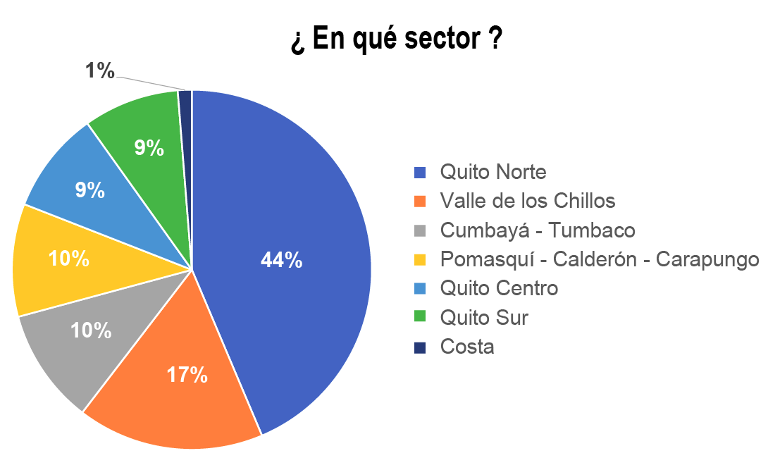 De ese gran total de $12.3 millones comercializados, el Gráfico No. 5 presenta la información de la cantidad de dólares invertidos según la ubicación geográfica de los proyectos. Como es de esperarse, Quito Norte se lleva la mayor parte del pastel, seguido por el Valle de Los Chillos, pero en tercer lugar está la zona de Cumbayá y Tumbaco que, aunque habiendo vendido menor número de inmuebles que Calderón, su precio unitario es superior