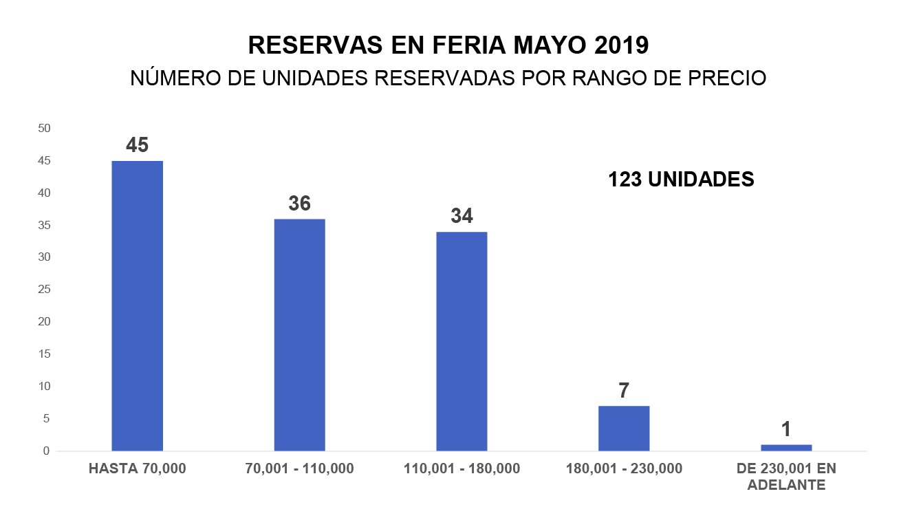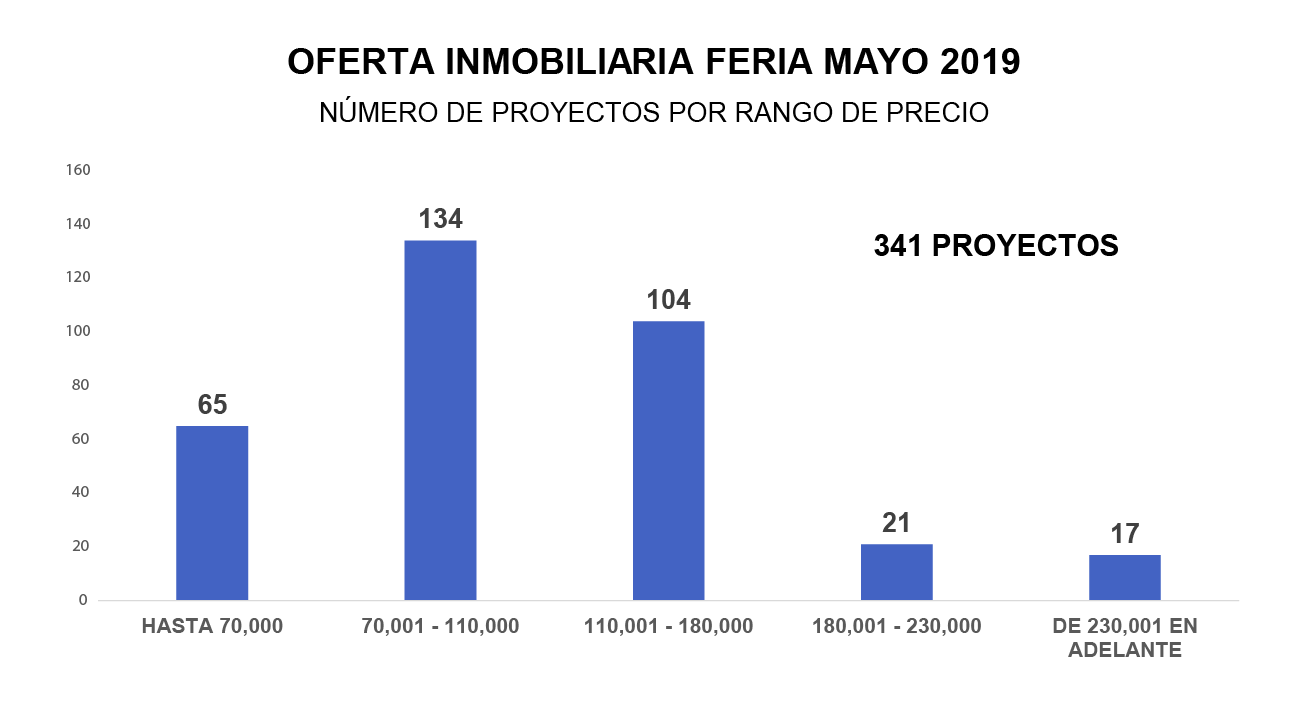 La Feria es el escenario idóneo para juntar la oferta con la demanda y sumar la posibilidad de conseguir financiamiento a largo plazo. Si partimos de la premisa de que, al acertar en ubicación y tipo de inmueble ofertado, el componente determinante en el escenario de venta es el precio, las ventas efectivas se darán en tanto la zona de ubicación sea la apropiada para el segmento socio económico al que la oferta apela. En el Gráfico No. 3 mostramos la distribución de los 341 proyectos por rango de precios.