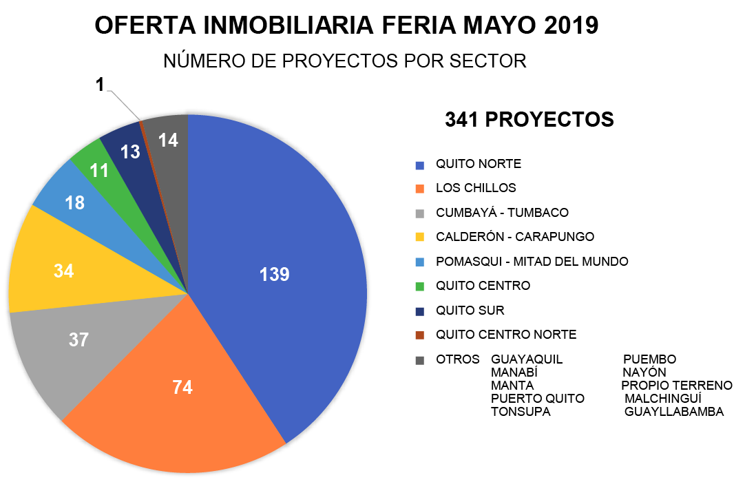 En el Gráfico No. 1 se refleja la distribución geográfica de los 341 proyectos que se ofertaron en la Feria. Se evidencia que las zonas de Quito Norte, Valle de Los Chillos, y los Valles de Cumbayá y Tumbaco siguen siendo los protagonistas. La zona de Calderón toma fuerza, seguida por Pomasqui.
