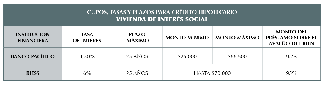 Además de estos positivos parámetros para crédito hipotecario, se han abierto líneas de crédito para financiar la compra de vivienda de interés social, es decir, aquella que cuesta máximo $90.000 y que cumple con ciertos requisitos, como ser la primera y única vivienda del comprador. Estos créditos hipotecarios también se precalificaron en Feria. En el Gráfico No. 11 el detalle de las condiciones que aplican.