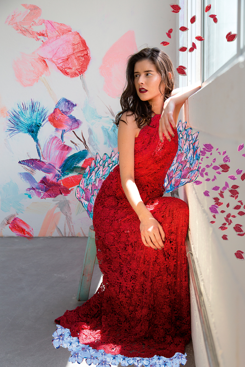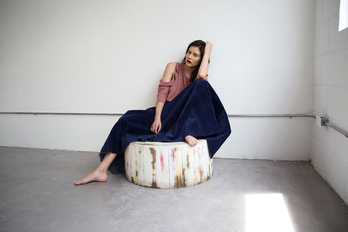 Pleated mustard skirt with blue croptop embroidered by hand with transparency