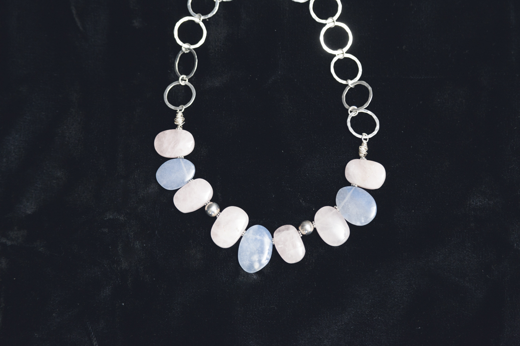 Trabajo con piedras semipreciosas enchapadas en plata y con baño de oro. Entre las que más utilizamos están el ámbar, quarzo rosado, lapislázuli y ónix.