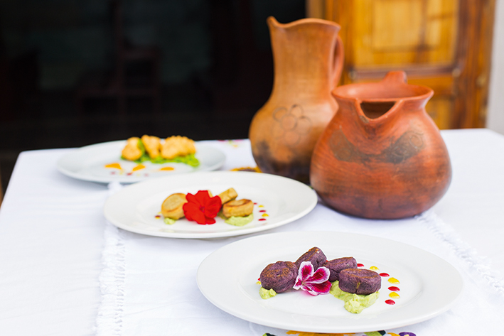 “Nuestra propuesta consiste en fusionar la danza y la gastronomía en este entorno tan especial, convirtiendo a esta experiencia en una vivencia para los cinco sentidos’’, nos dice. No podían faltar las novedosas Bonitísimas realizadas con la tradicional harina de maíz morado, el Pollo a las Antiguas Reglas, que es un guiso en salsa de mariscos o el Lomo del Cura cubierto con una salsa elaborada con vino de consagración. Estos platos, con una antigüedad de más de 200 años, se han recuperado para llegar a las mesas en Los Milagros.