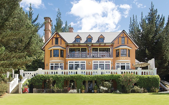 Una casa estilo Tudor que parecería sacada de la Inglaterra del siglo XVI, con enredaderas que han crecido sobre las columnas de la entrada, invadiendo poco a poco y haciendo suyo el balcón de la segunda planta; techos de media agua, un ático en el tercer piso con tramado de madera en su fachada frontal, torretas incorporadas en el exterior de la casa, y en el techo una chimenea de ladrillo con detalle en su columnar.