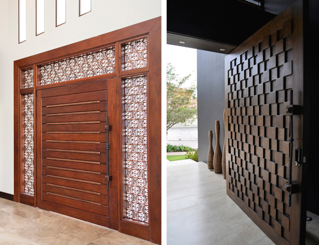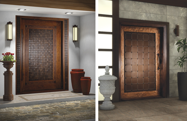 Estilo de puerta que combina hierro, vidrio y madera de pambil con terminados texturizados en óxidos, creando un producto final de volumen sobredimensionado. Y una tercera opción que es un claro trabajo en cobre, combinado con madera y calados, tratada especialmente, para completar diseños artísticos exclusivos.