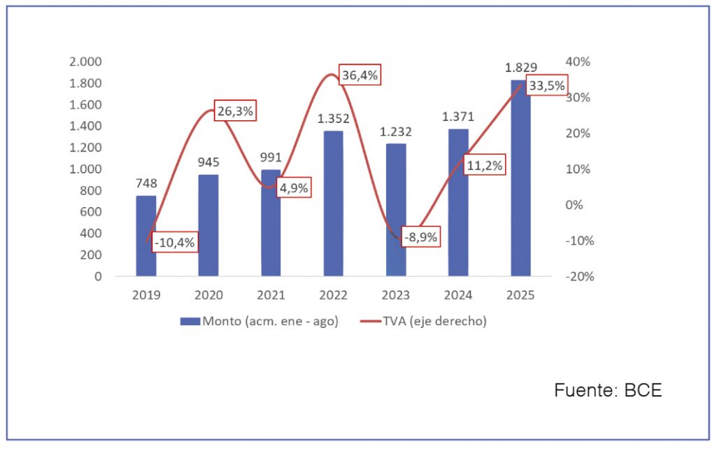 Según cifras del Banco Central de Ecuador (BCE), entre enero y agosto de 2025 la banca privada colocó $425 millones en créditos de vivienda. Esto implicó una contracción de 12,7% frente al mismo periodo de 2024 (Gráfico 1), sin embargo, el financiamiento destinado a empresas de construcción y actividades inmobiliarias creció 33,5% anual en ese mismo lapso (Gráfico 2).